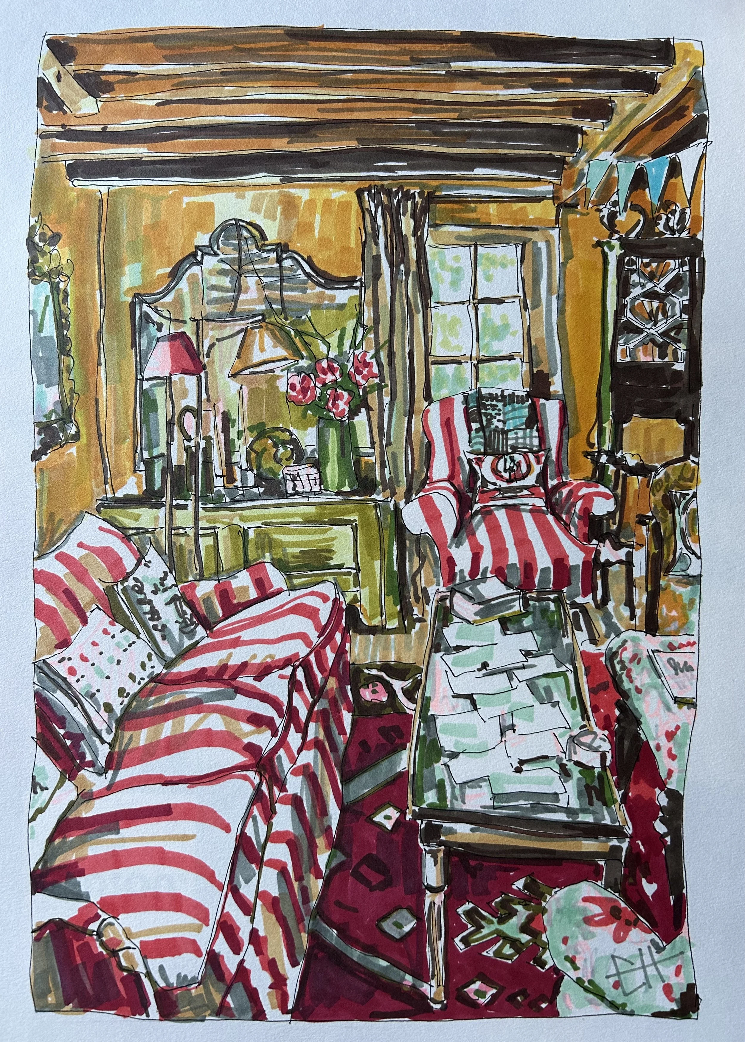During a Covid Lockdown, I discovered Artist and Author Sarah Jane Axleby’s wonderful Instagram account Room Portrait Club. Most weeks, she posts a photo prompt for artists to interpret however they would like. She choses a selection of entries to repost and share. Responses come in all kinds of media from all around the world. I love to take part when I can. This is a recent effort for Week 202 featuring a room from @marinmontagut shot by photographer @dean.hearne. I was lucky enough to be chosen by SJ to have my work reposted with this entry. I used a fine nib pen to map out the outlines then one of my all time favourite mediums - graphic markers. I love the effects you can get with graphic markers. They remind me of drawing with textas as a kid, but there is something painterly about them too. They come with two tips - a narrow, rounded one and my preferred thicker, chisel tip. You can work in a fast, splashy way which is very joyful and fun!